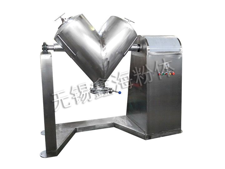 V型混合機一端裝有電機與減速機,電機功率通過皮帶傳給減速機,減速機再通過聯(lián)軸器傳給V型桶。使V型桶連續(xù)運轉(zhuǎn),帶動桶內(nèi)物料在桶內(nèi)上、下、左、右進行混合。